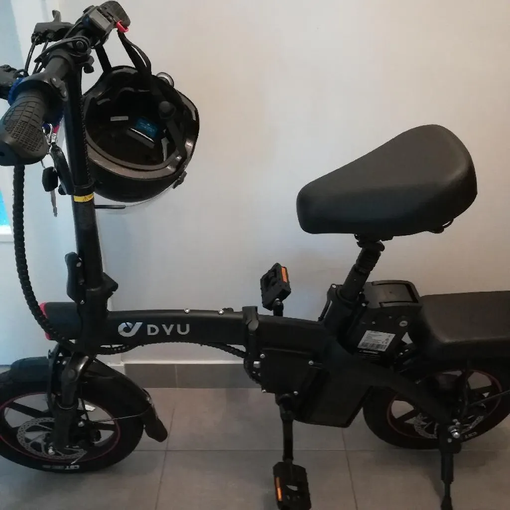 Hij is niet zwaar, neemt weinig ruimte in, de accu is uitneembaar en de fiets is opvouwbaar — dus ik kan hem zelfs meenemen in de bus! En je kunt er ook mee rijden zonder te trappen.