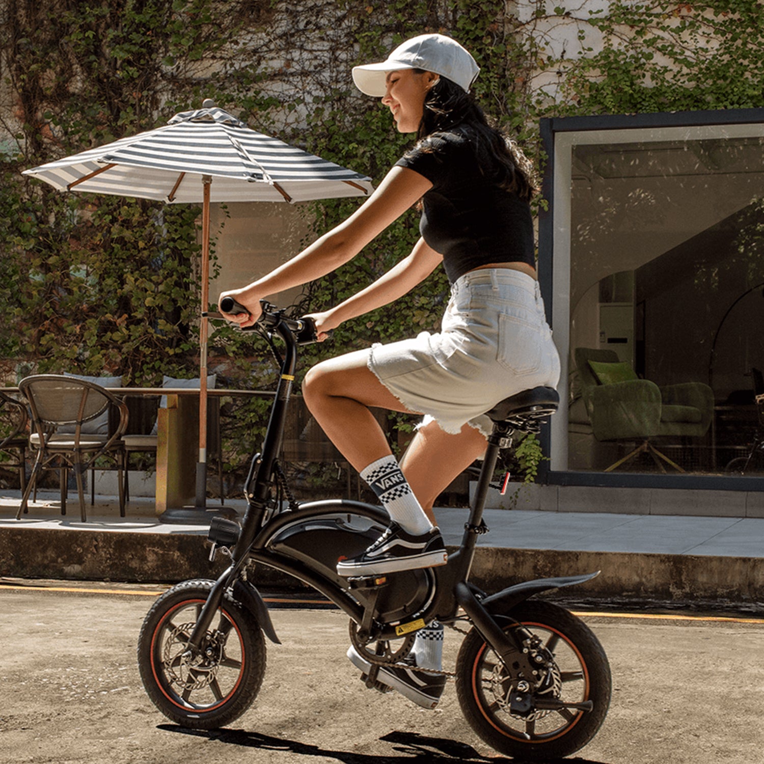 Je hebt geen sleutel nodig; de fiets wordt geactiveerd met een knop op het linkerhandvat. Een van de redenen waarom ik deze fiets heb gekocht, is dat hij in de kofferbak past — geen fietsendrager of dakrek nodig. Ik ben geen fanatieke fietser, maar ik geniet van ontspannen ritjes en heb geen behoefte aan hoge snelheden. 24 km/u is meer dan genoeg voor zo’n compacte fiets.